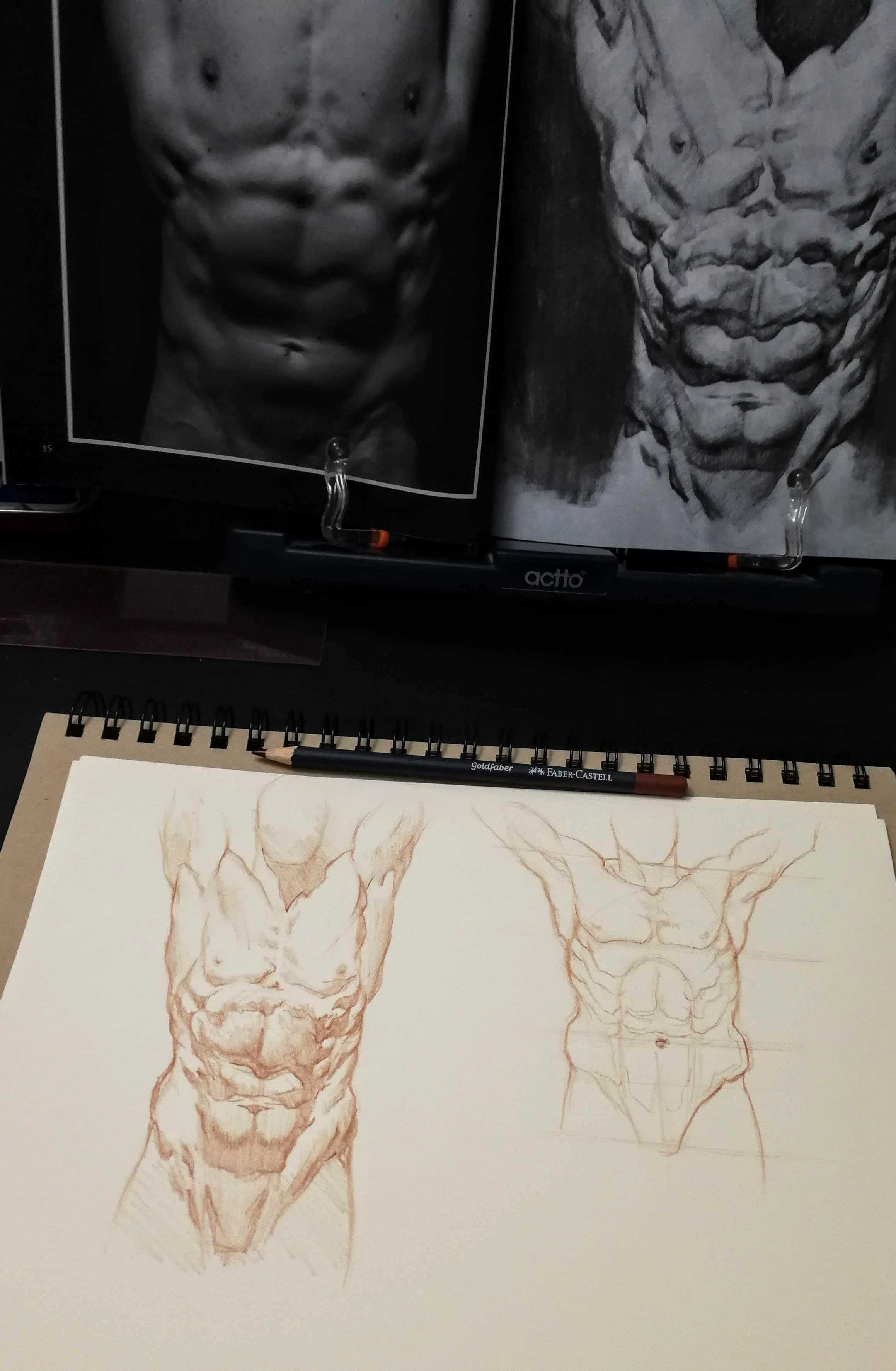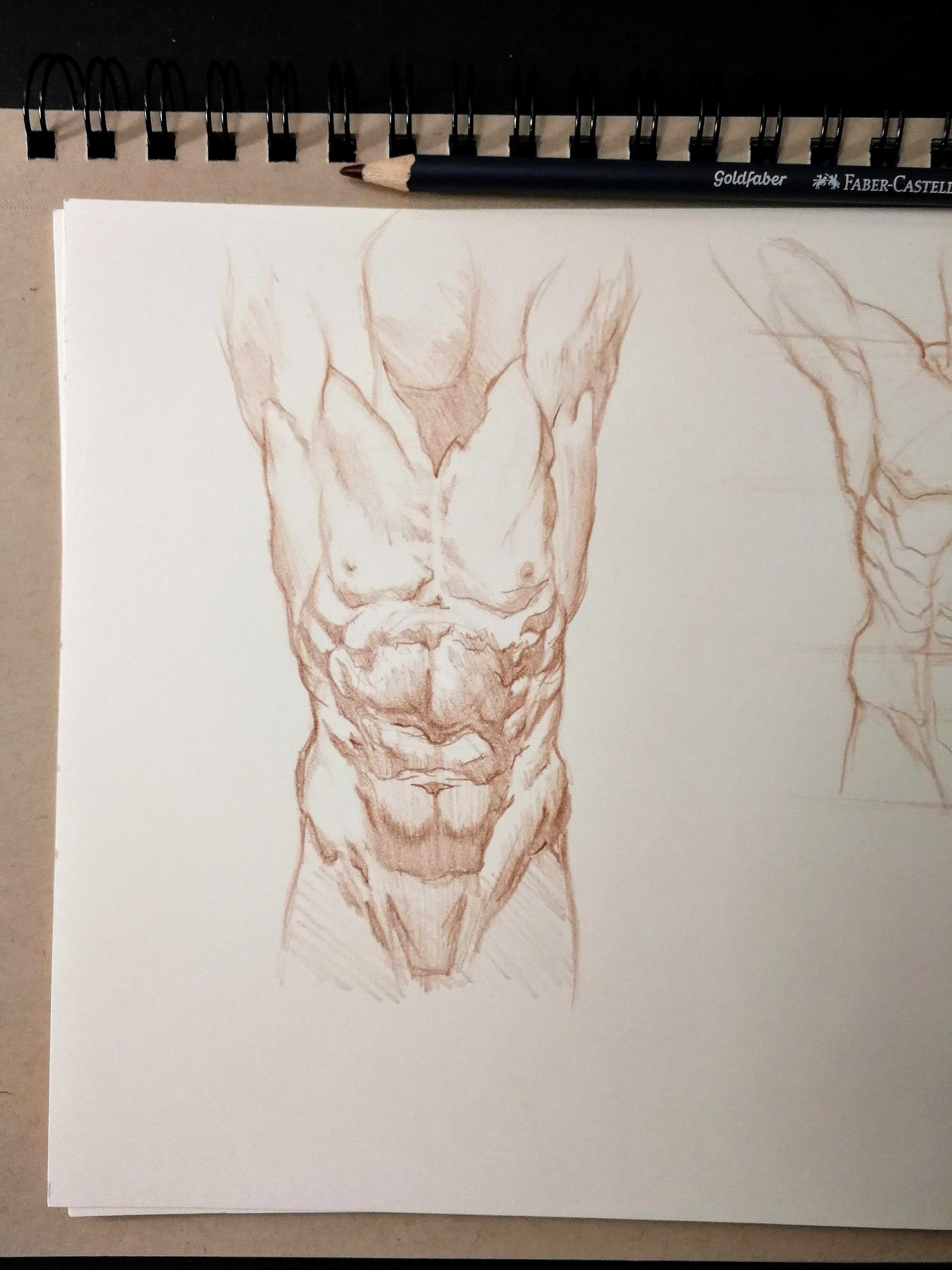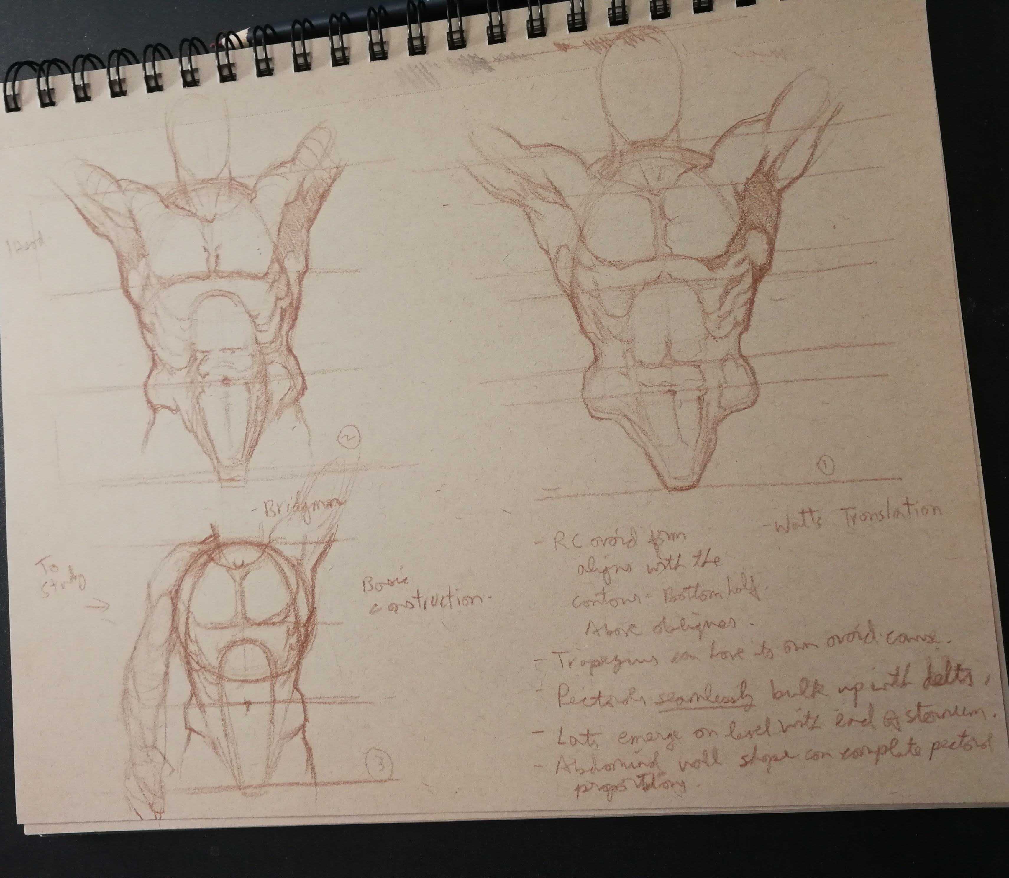 I understood the simplified forms to be able to make a torso from imagination and exercised that information in the drawing from the reference while learning some rendering techniques.